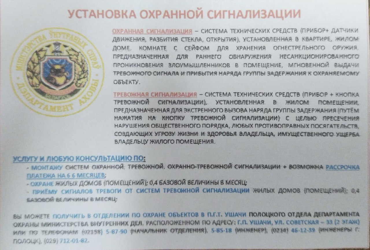 Полоцкий отдел Департамента охраны МВД напоминает, что одним из эффективных способов обеспечения безопасного хранения и исключения несанкционированного доступа посторонних лиц к вашему оружейному сейфу является установка системы охранной сигнализации! За любой консультацией вы можете обращаться в Ушачское подразделение охраны по адресу: г п. Ушачи, ул. Советская, 33 либо по телефону 5-85-18. Ждём вам в рабочие дни с 9 до 18.