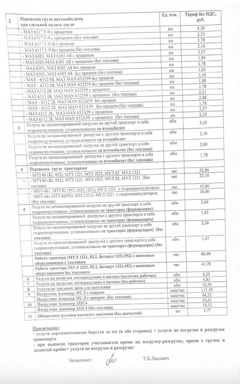 Примечание: - услуги лесовозов и сортиментовозов берутся за км (в обе стороны) + услуги по погрузке и разгрузке транспорта