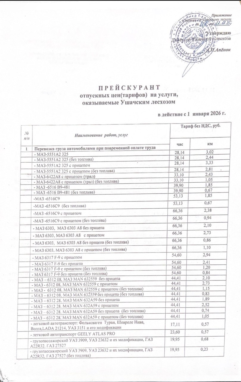 Отпускные цены (тарифов) на услуги на 01.01.2026 года, оказываемые Ушачским лесхозом